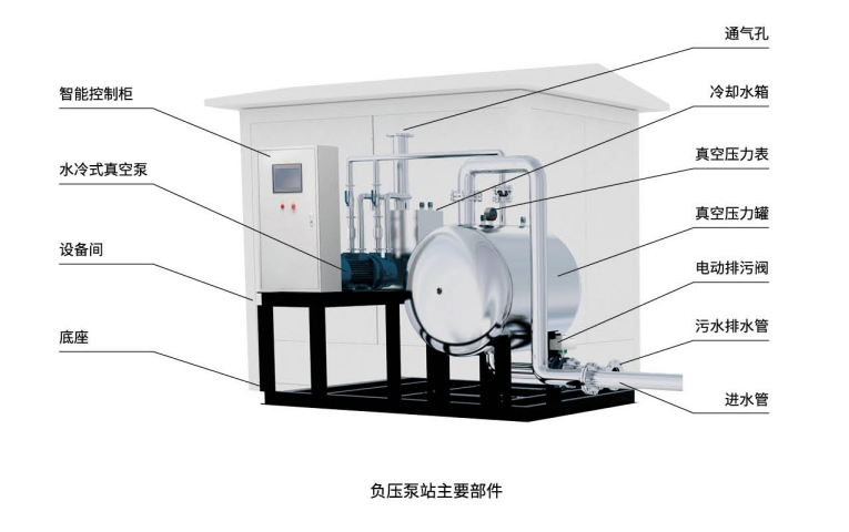 負(fù)壓站是負(fù)壓排水系統(tǒng)的動(dòng)力源站,主要由真空壓力罐、真空泵,排污泵、物聯(lián)網(wǎng)智慧控制系統(tǒng)組成。收集來的污水在負(fù)壓梯度力的輸送作用下經(jīng)負(fù)壓污水管網(wǎng)進(jìn)入真空壓力罐。當(dāng)污水收集罐內(nèi)的污水液位上升到設(shè)定值時(shí),排污泵啟動(dòng)或排污閥打開,將污水排至一體化污水處理設(shè)備或市政污水管網(wǎng)。